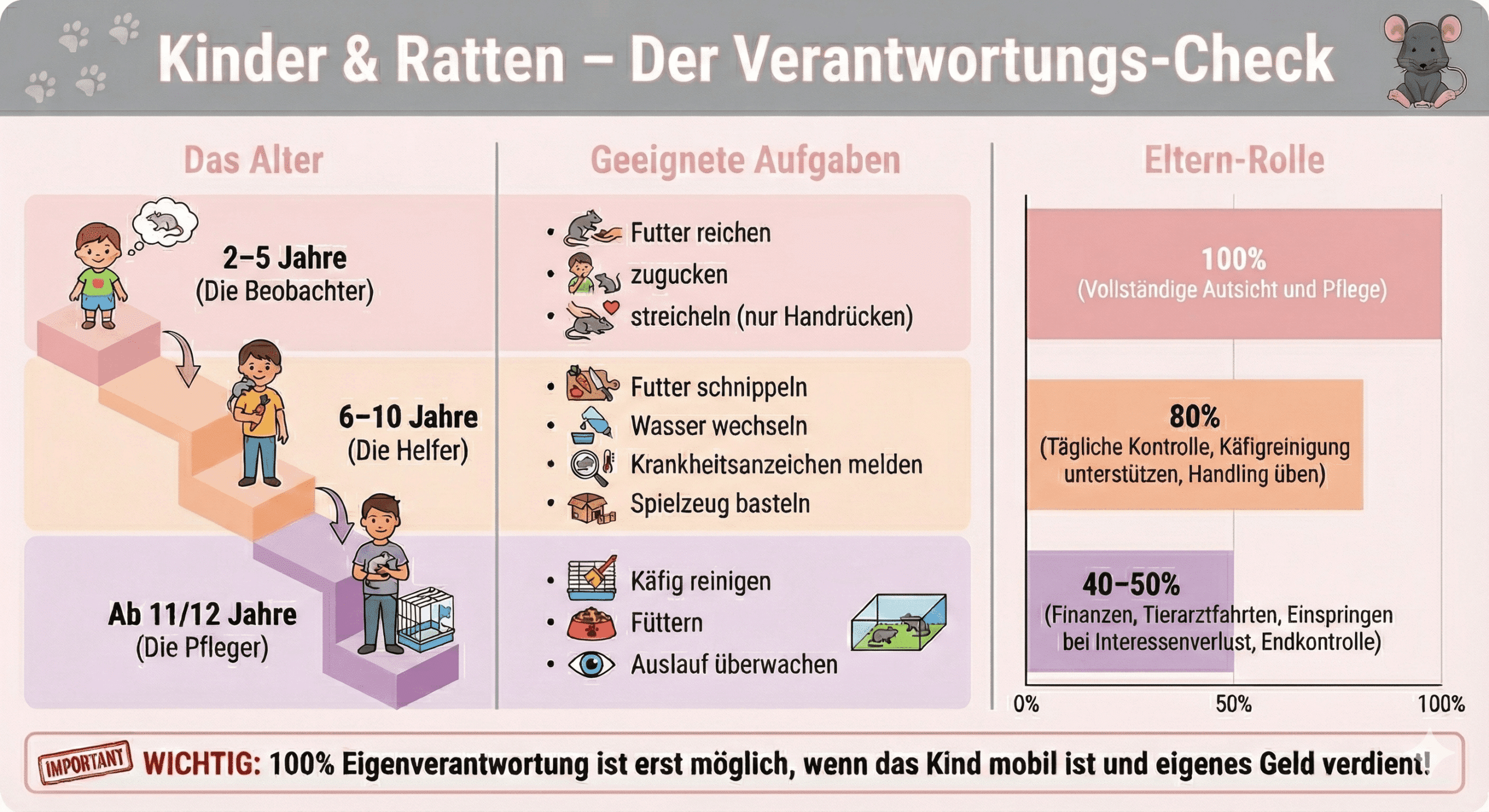 Eine Ratte ist als Haustier für Kinder geeignet, wenn die ganze Familie dahintersteht. Die Vorstellung, dass ein Kind ab einem bestimmten Alter (z. B. 12) alles alleine macht und Du Dich heraushalten kannst, ist eine Illusion.